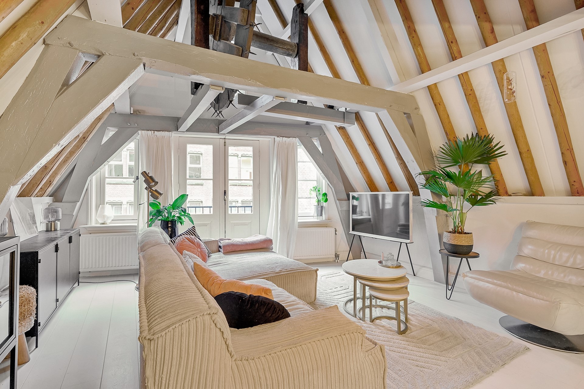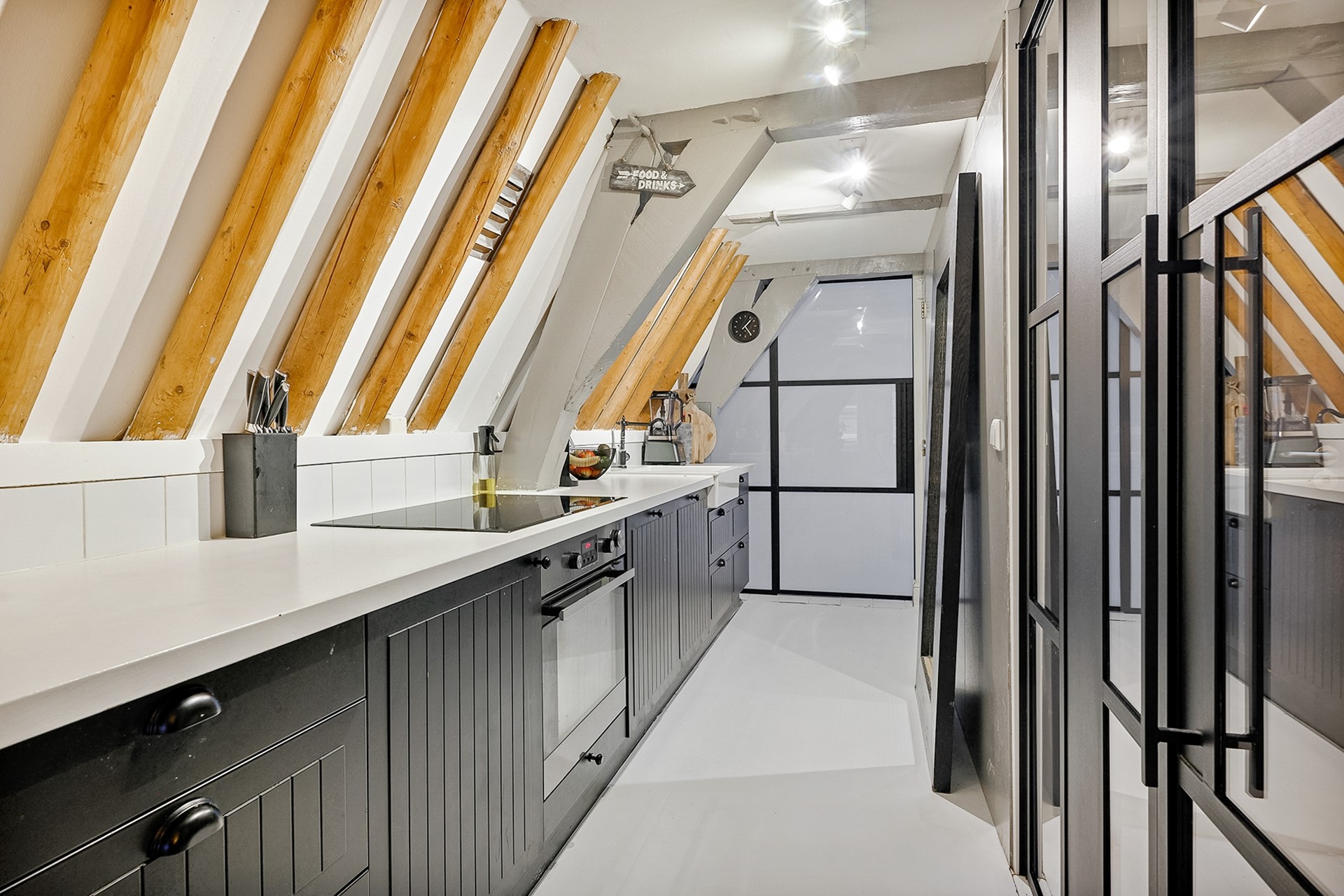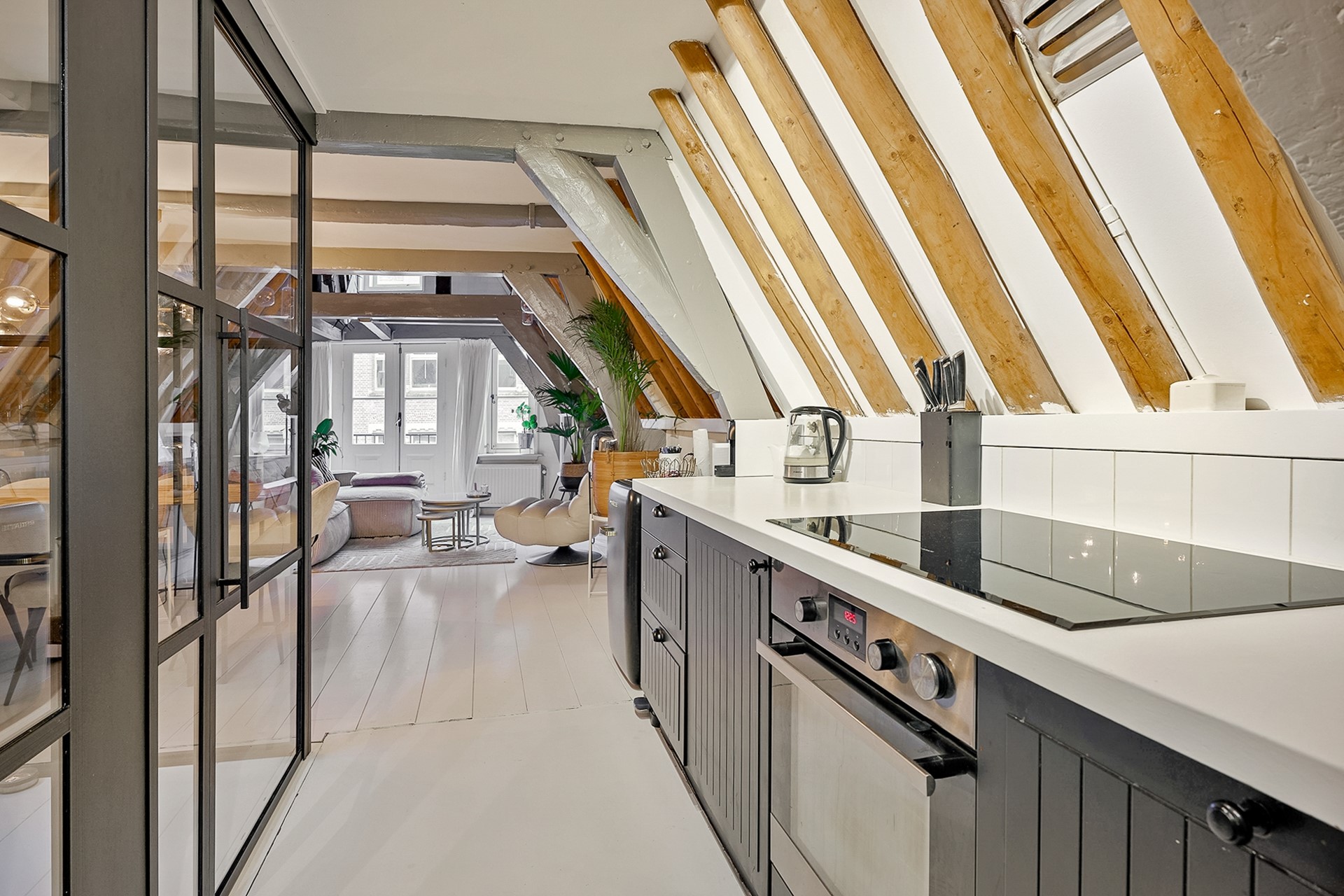 Entrance via the shared staircase with the front door on the second floor. A hallway with convenient built-in shoe shelves and coat storage is located. Stairs lead to the third floor landing. Here you'll find the toilet and a beautiful, round white staircase to the third floor. From the landing, you can look through the beautiful black steel glass walls into the living room. The living room at the front of the property feels spacious and open, with beautiful exposed ceiling beams and French doors leading to the west-facing French balcony. Robust white oak flooring runs throughout the third floor. The monumental and decorative hoist mechanism in the living room is a real eye-catcher!