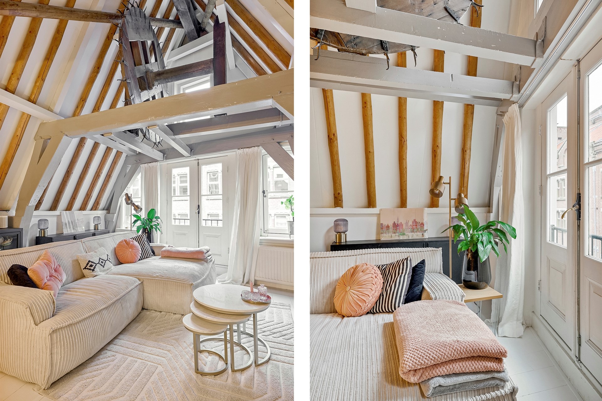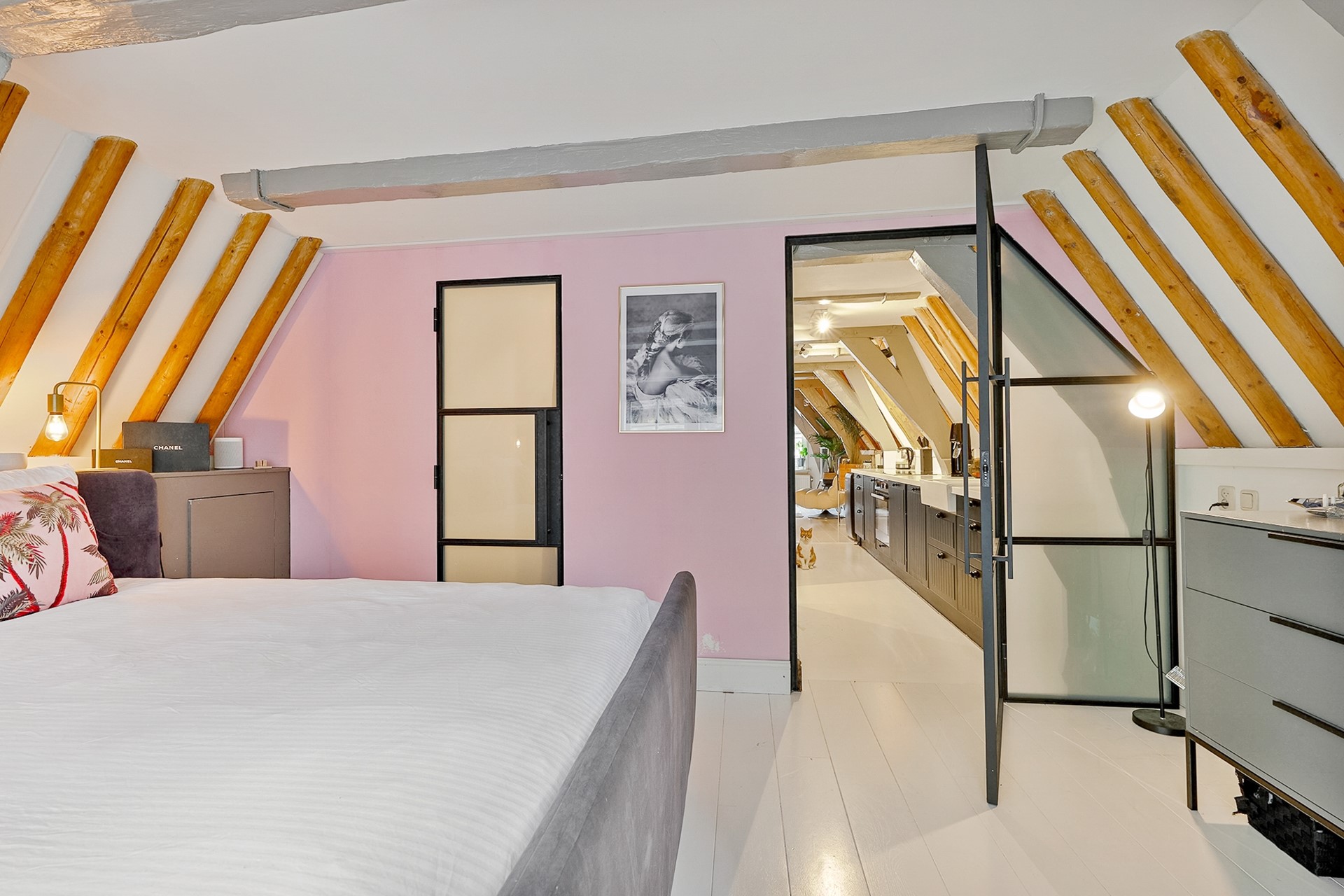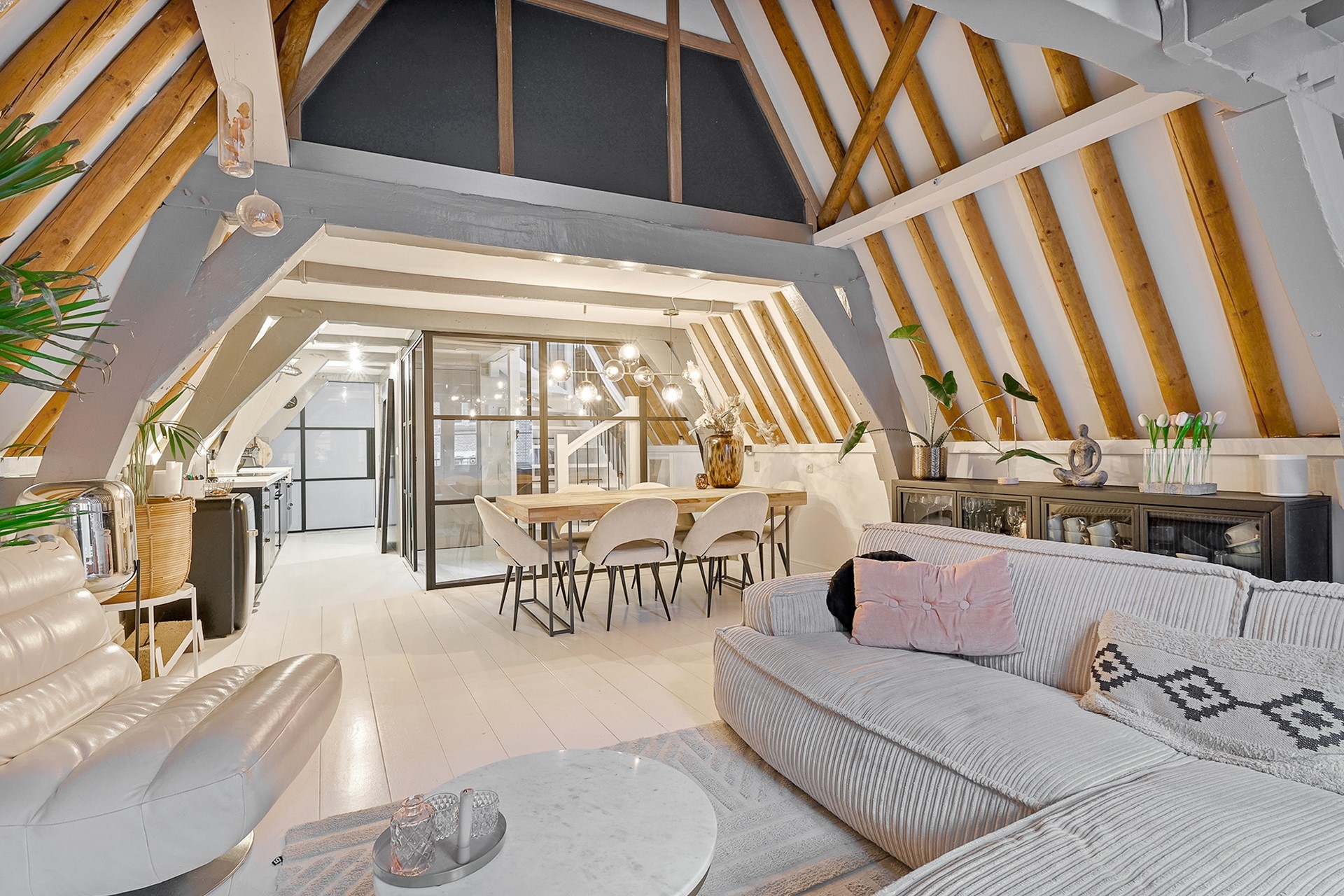 Entrance via the shared staircase with the front door on the second floor. A hallway with convenient built-in shoe shelves and coat storage is located. Stairs lead to the third floor landing. Here you'll find the toilet and a beautiful, round white staircase to the third floor. From the landing, you can look through the beautiful black steel glass walls into the living room. The living room at the front of the property feels spacious and open, with beautiful exposed ceiling beams and French doors leading to the west-facing French balcony. Robust white oak flooring runs throughout the third floor. The monumental and decorative hoist mechanism in the living room is a real eye-catcher!