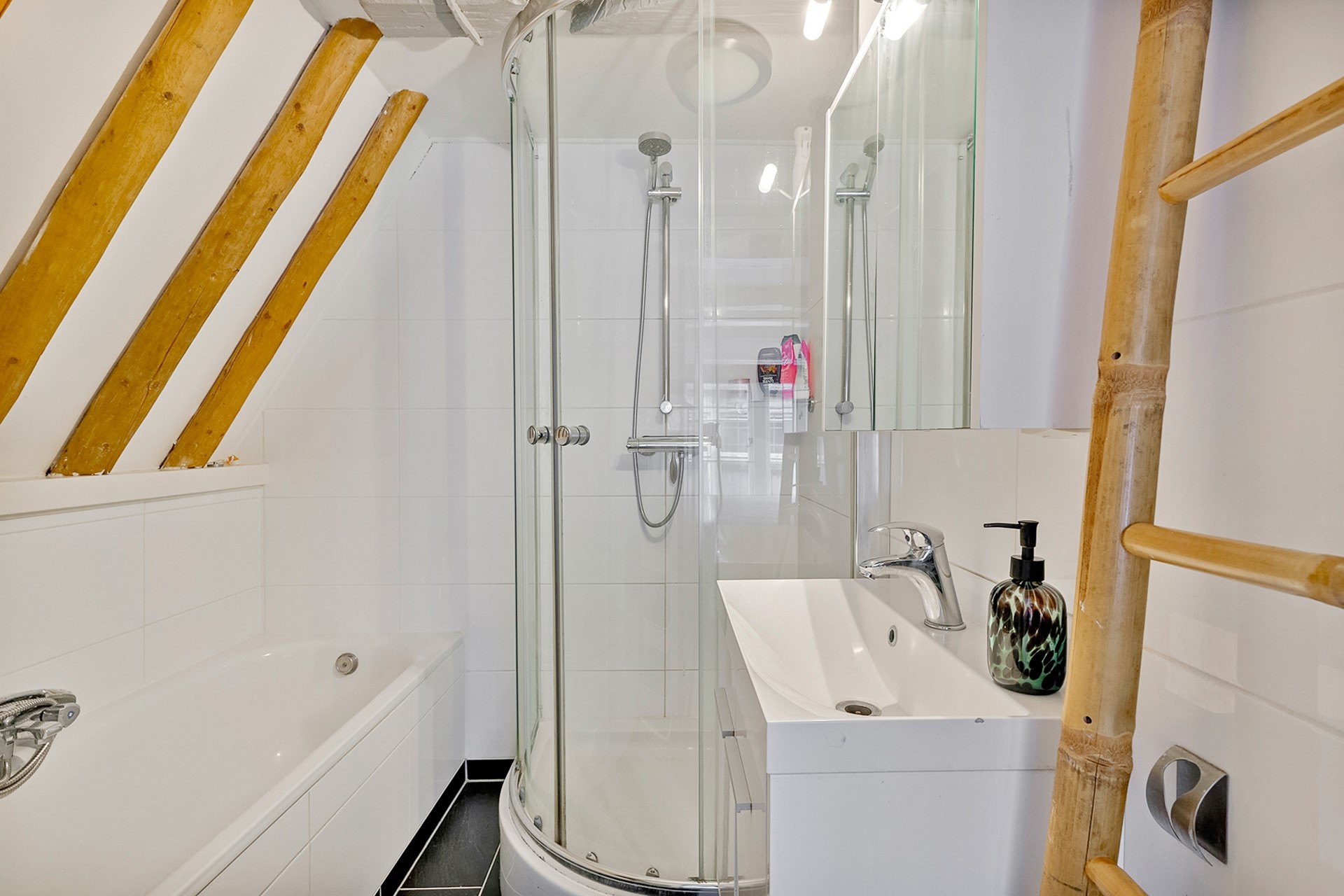 Vanuit de woonkamer kom je in de lichte open keuken met zwarte kastjes, extra grote witte spoelbak en mooi wit massief houten aanrechtblad van bijna 4,5 meter lang. De keuken is voorzien van een mooie epoxy gietvloer en heeft alle gewenste inbouwapparatuur. Daarnaast is er veel ingebouwde kastruimte. Aan de achterzijde bevindt zich de eerste ruime lichte slaapkamer met en suite een mooie compacte badkamer voorzien van ligbad, douche en wastafel.