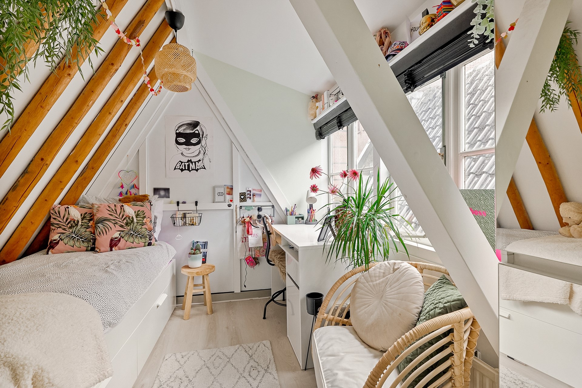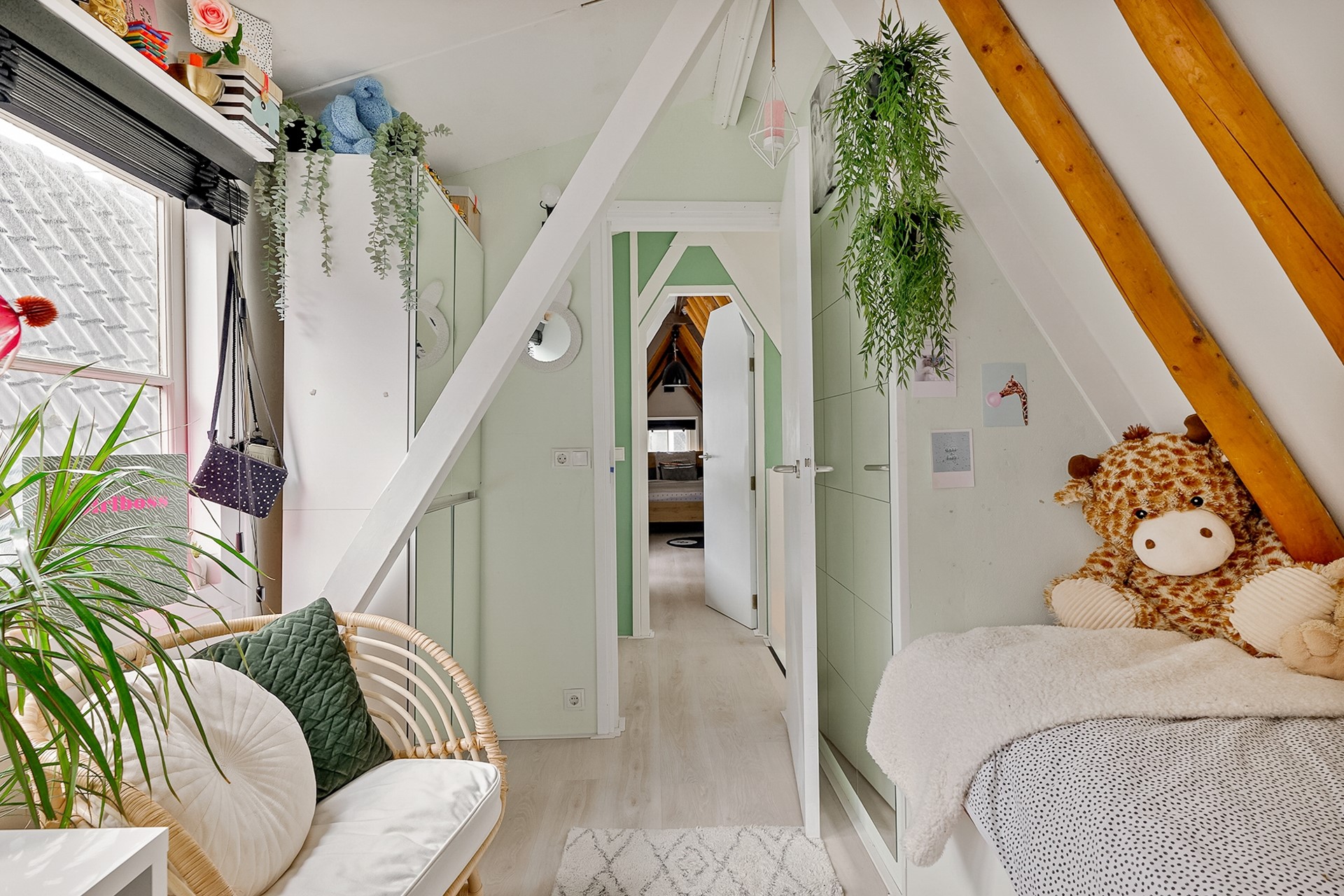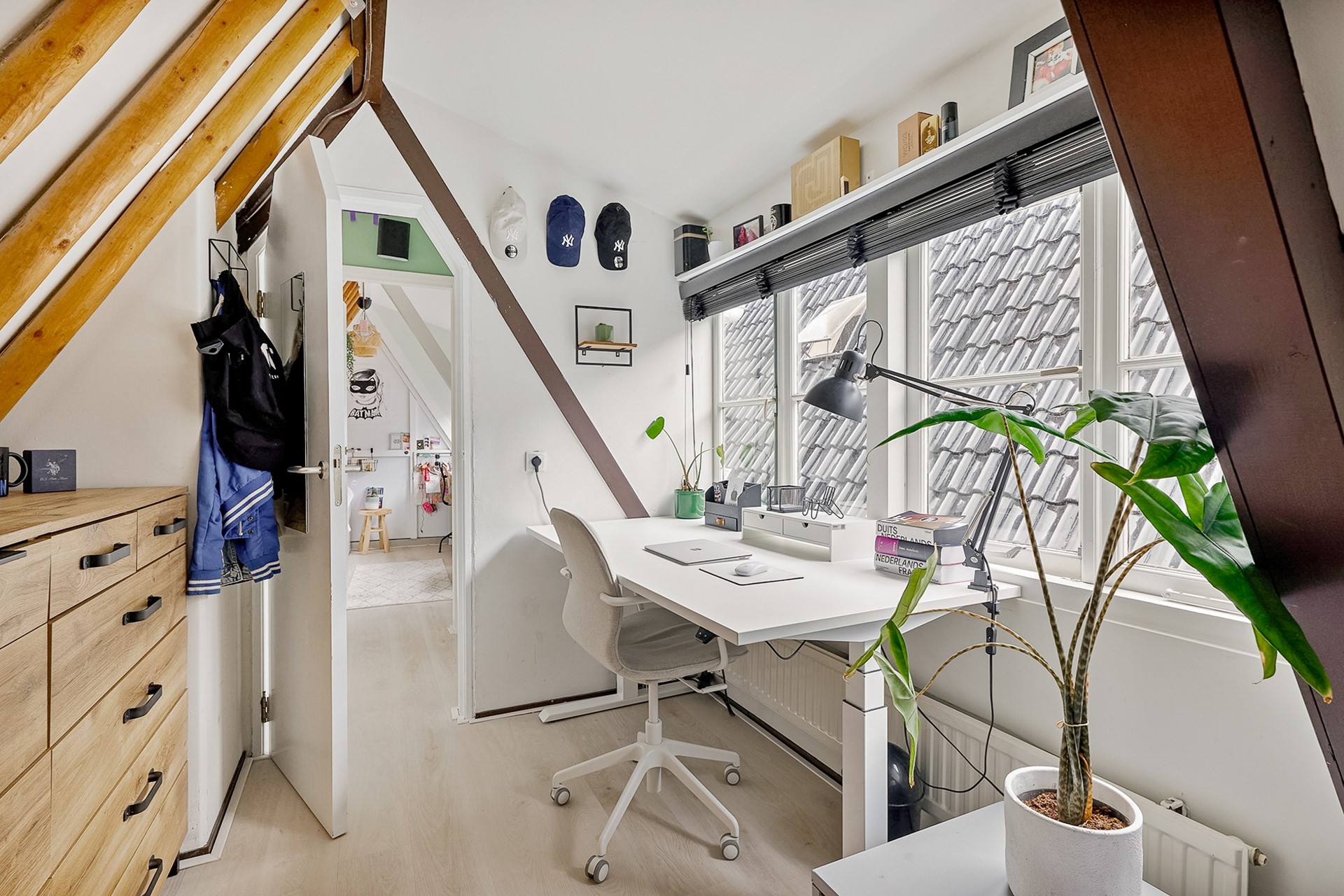 the stairs, a dormer window allows plenty of light to enter both the upstairs and the living room through the steel glass walls. On the fourth-floor landing, a roughly four-year-old central heating boiler is located in the storage room. The cozy second and third bedrooms are located at the front and rear, both with dormer windows, allowing for plenty of natural light. The entire fourth floor has soundproof, light wood-look PVC flooring. The third bedroom extends into a ridge, creating a cozy alcove where a double bed can be placed. From the window, you have a view of the charming Oude Kerk (Old Church).
