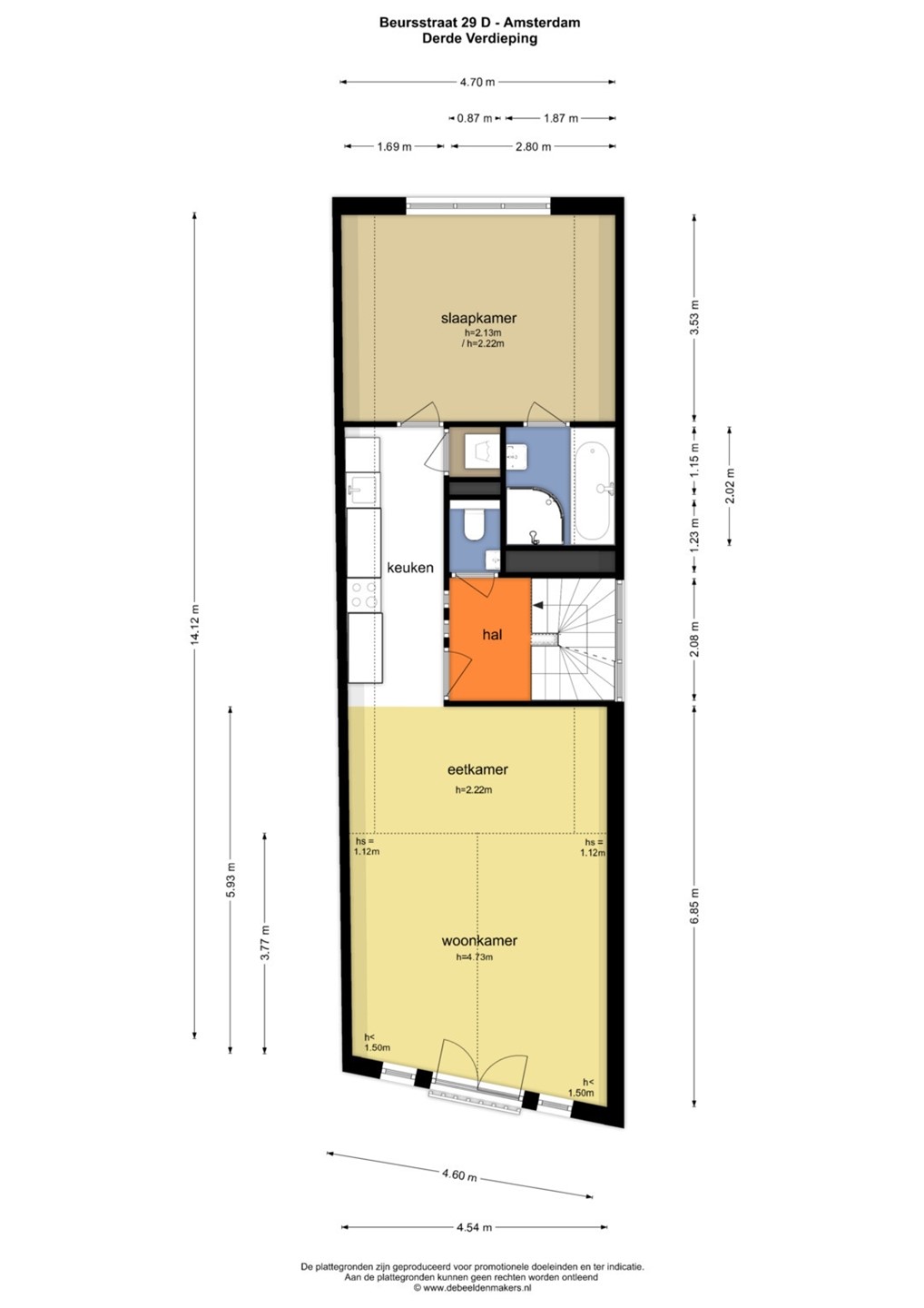Via de ronde trap achter de glazen wanden kom je op de overloop van de 4e verdieping. Bovende trap bevindt zich een dakkapel waardoor er boven en in de woonkamer via de stalen glazen wanden veel lichtinval is. Op de overloop van de 4e verdieping is in de berging een circa 4 jaar oude CV-combiketel opgesteld. Aan de voor- en achterzijde bevinden zich de knusse tweede en derde slaapkamer, beide voorzien van een dakkapel waardoor er ook daar veel lichtinval is. De gehele vierde verdieping is voorzien van een geluidswerende lichte houtlook PVC-vloer. De derde slaapkamer loopt uit in een nok waardoor er een knusse nis ontstaat, waaronder een 2-persoonsbed bed kan worden geplaatst. Uit het raam heb je uitkijk op de charmante Oude Kerk.