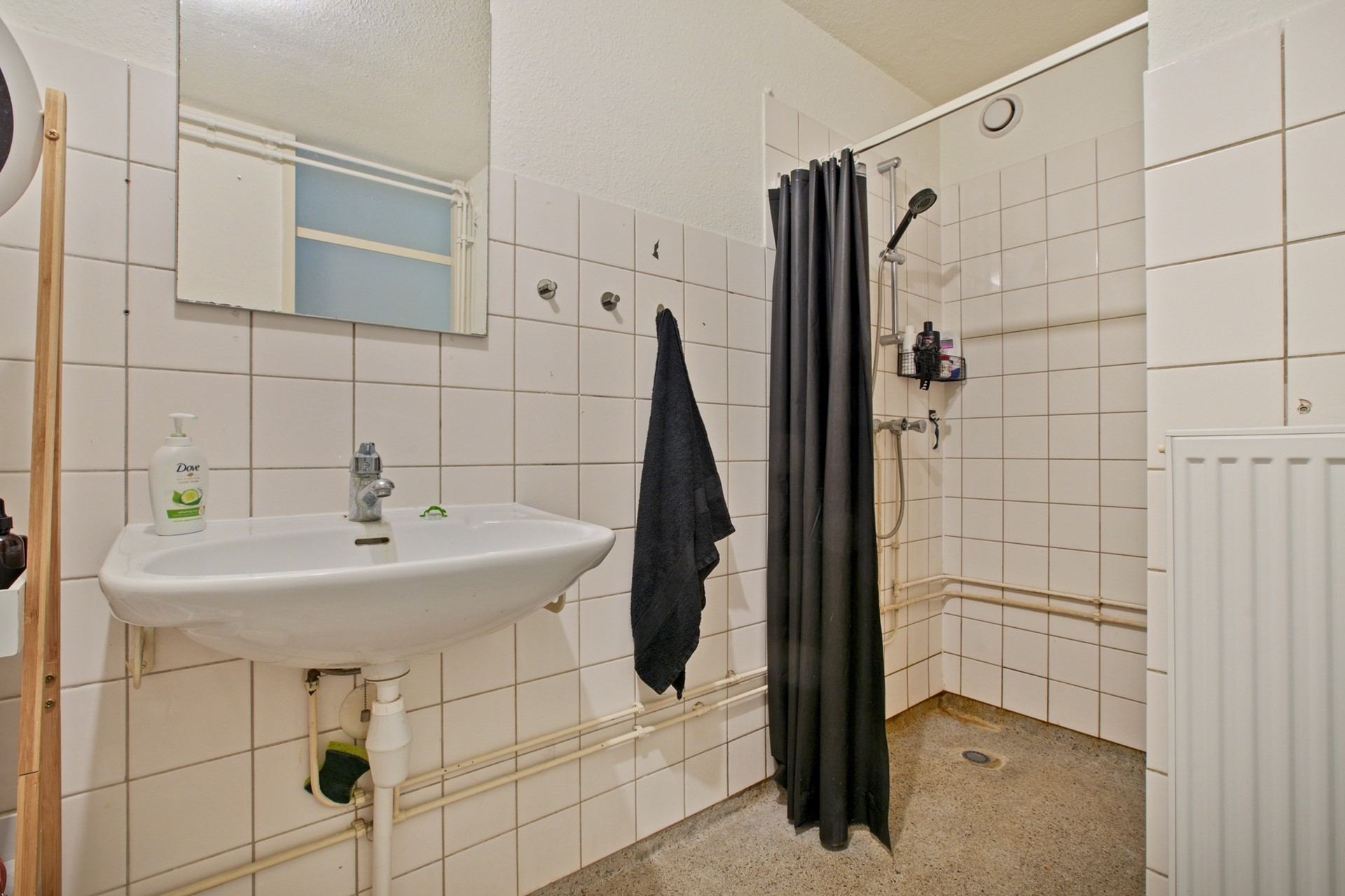 Entree appartement op de 1e verdieping via het gemeenschappelijk trappenhuis: gang met garderobemogelijkheden en meterkast. Nette badkamer, voorzien van een douche, wastafel en wasmachine- en drogeraansluiting. Separaat toilet met fonteintje. De lichte woonkamer/slaapkamer is aan de voorzijde gelegen met toegang tot het zonnige balkon. Deze kamer heeft voldoende ruimte om een extra kamer te creëren. Half open keuken aangrenzend aan de woonkamer. Tot slot is er nog op de begane grond een gedeelde berging van bijna 5 m², ideaal voor het stallen van de fietsen of andere opslag.