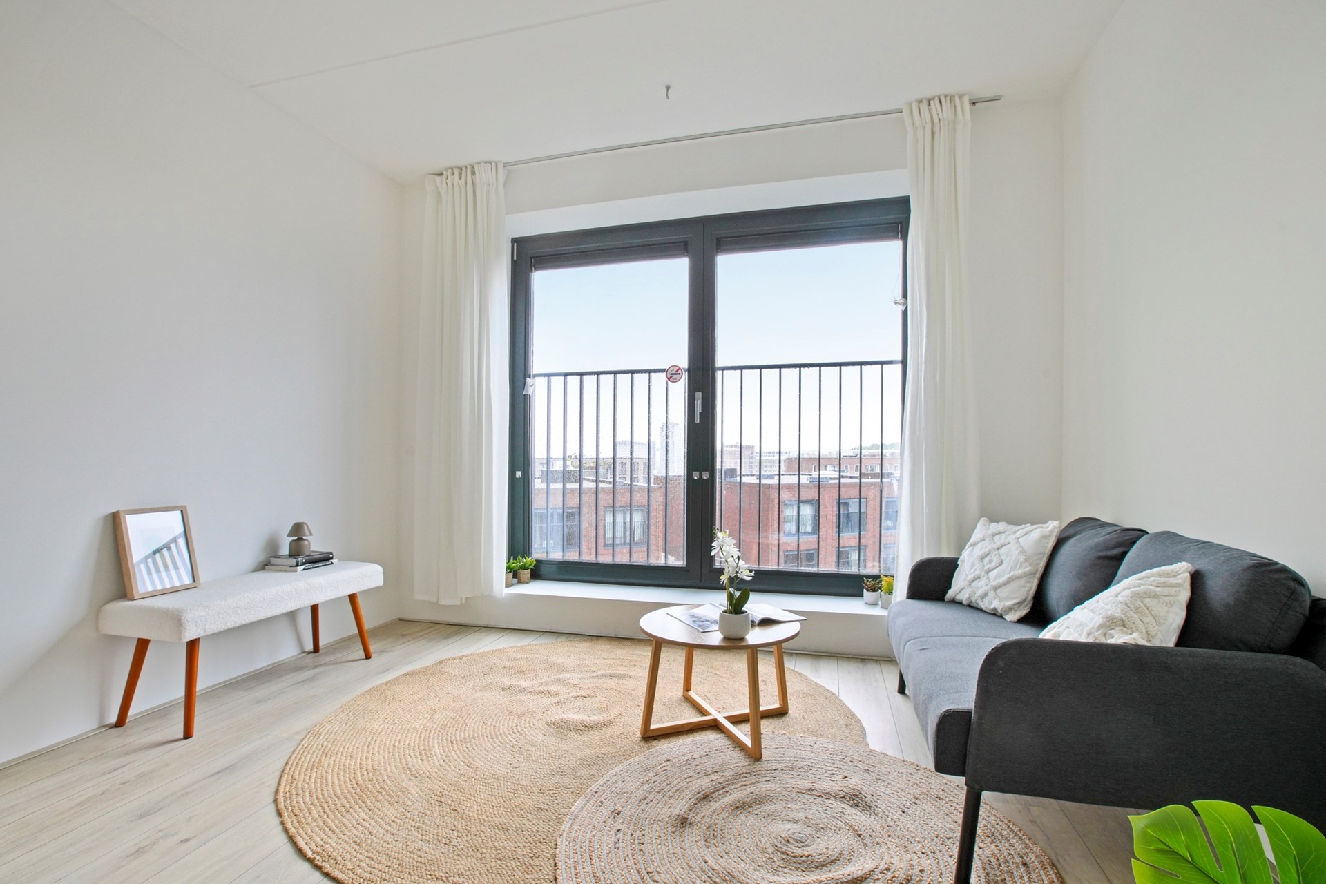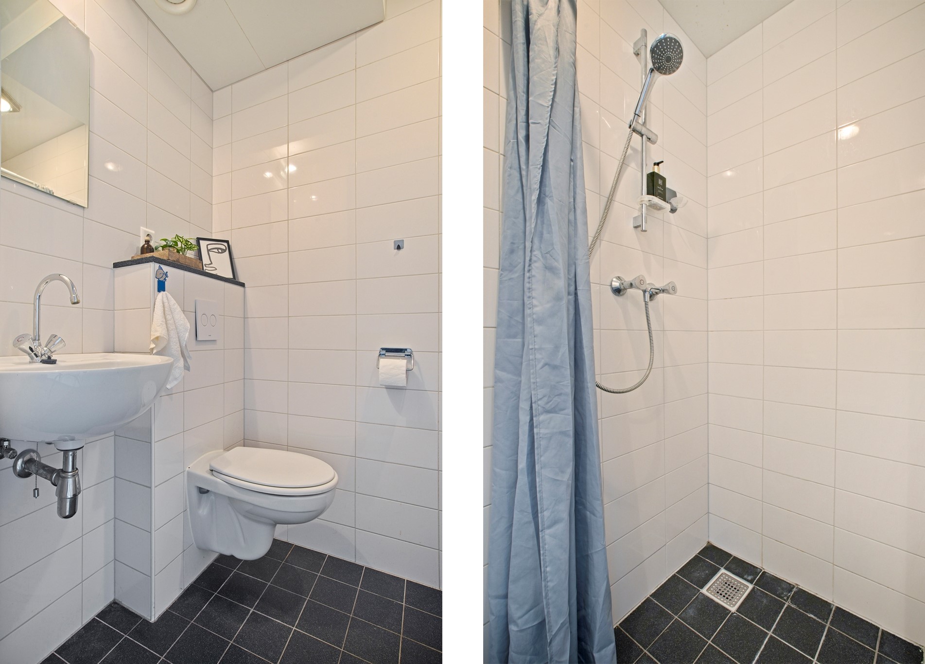 Open the front door, and you'll immediately notice how bright the apartment is. On your right is the modern bathroom. It features a wall-hung toilet, sink, and walk-in shower, giving it a very fresh look. Continuing through, on your left is the modern kitchen, equipped with various built-in appliances such as a combination oven and refrigerator. The washing machine is also located here. Continue walking and you'll reach the sleeping/living area with its beautiful, large French doors. The apartment is very well insulated, so you won't be bothered by street noise or other disturbances.