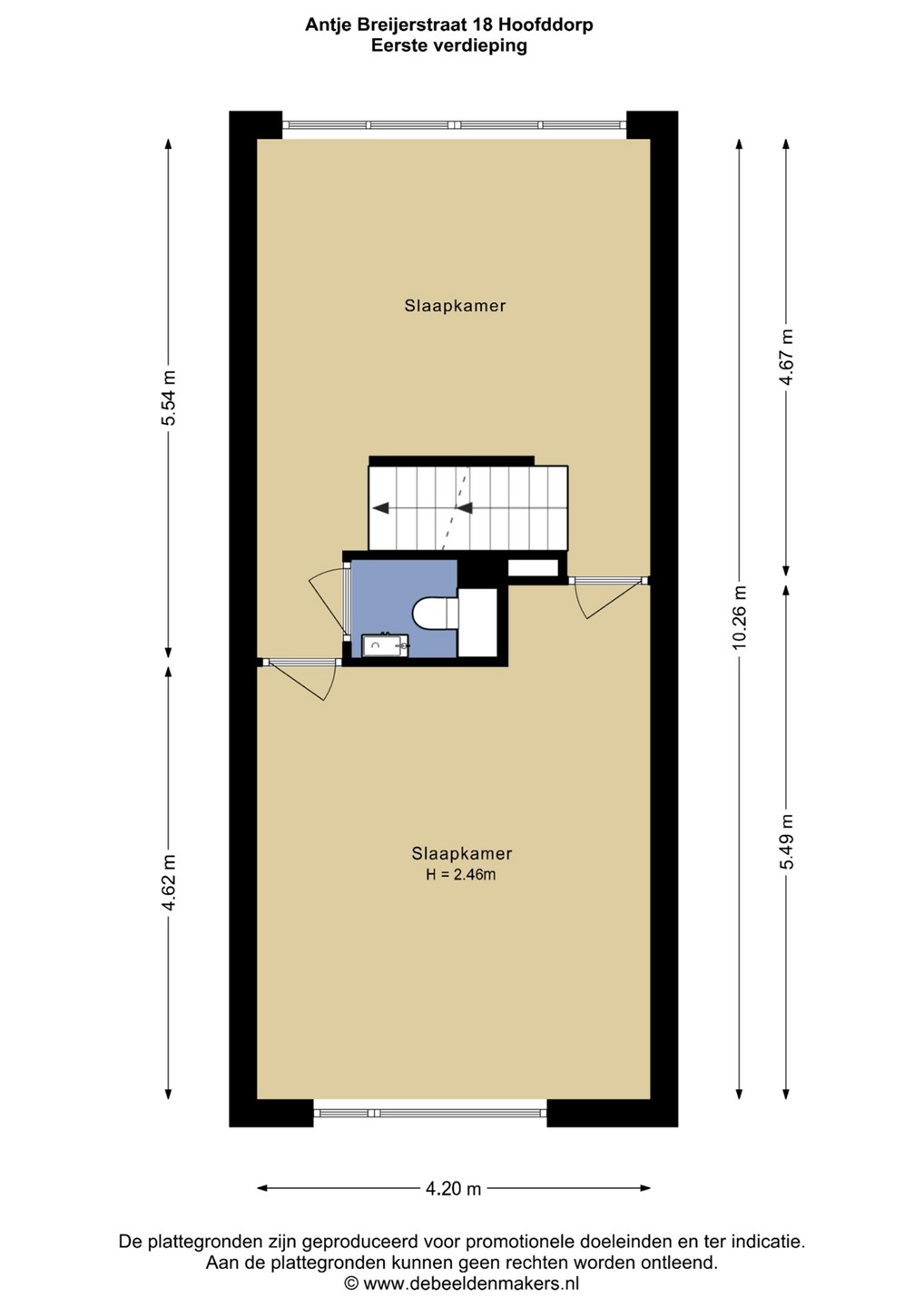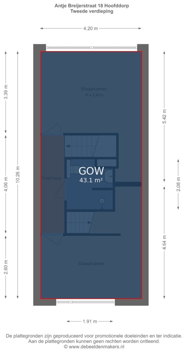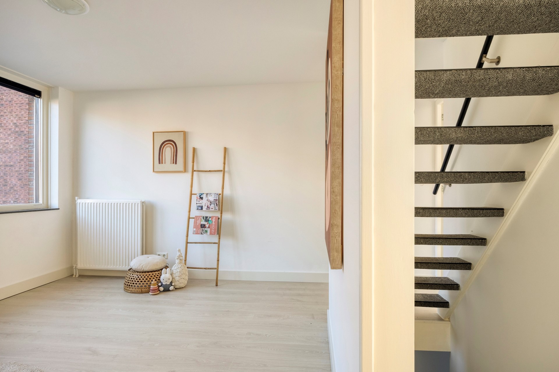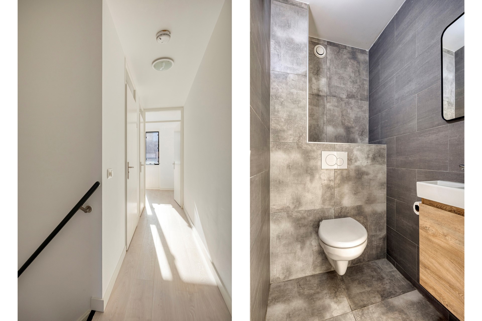 Eerste verdieping: Overloop met toegang tot 2 ruime en lichte slaapkamers waarvan een slaapkamer is gelegen aan de voorzijde van de woning. Het is echter heel goed mogelijk om op deze verdieping je woongedeelte te creëren. De aansluitingen voor een 2e keuken zijn aanwezig en op deze verdieping tref je een separaat toilet met fonteintje.