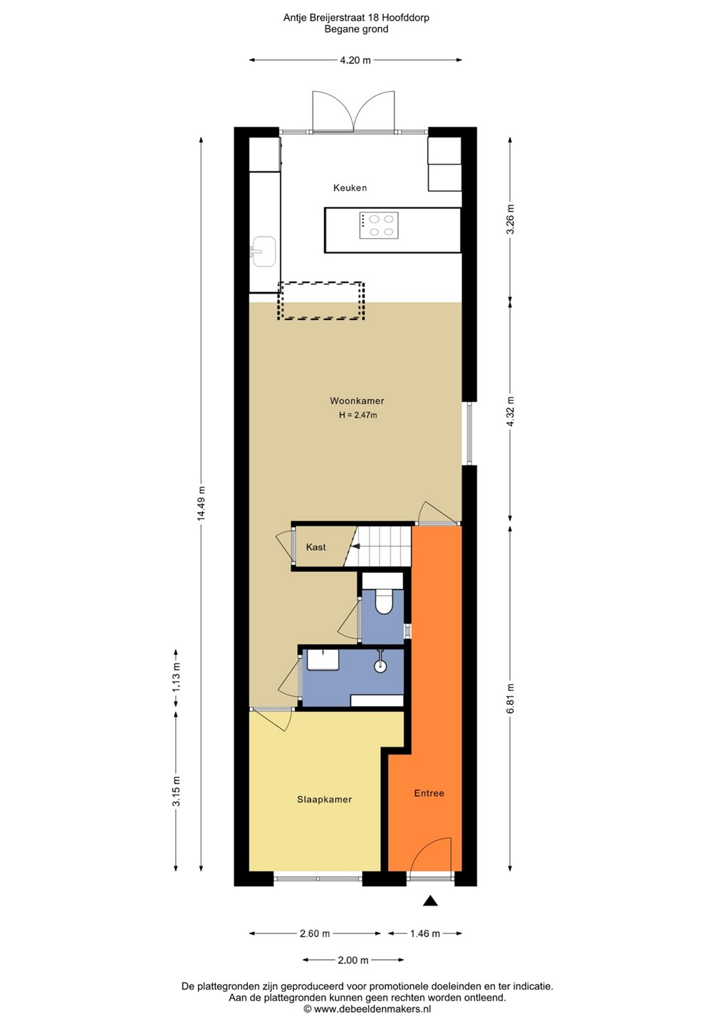 Begane grond: Voortuin, entree, lange hal met separaat toilet met fonteintje. Vanuit de gang kom je in de ruime woonkamer/eetkeuken met de splinternieuwe fraaie open keuken. Zowel de woonkamer als de keuken zijn zeer licht door de grote raampartijen en de dakramen. De moderne en nieuwe open keuken is voorzien van nagenoeg alle denkbare inbouwapparatuur. Vanuit de keuken heb je toegang via de openslaande deuren tot de verzorgde achtertuin. De achtertuin meet ca. 36m2 groot, is onderhoudsvriendelijk aangelegd en gelegen op het noordwesten. In de tuin vind je de grote houten berging en achterom. Aan de voorzijde tref je de eerste badkamer met douche en wastafel en een (slaap)kamer of een praktisch kantoor aan huis.