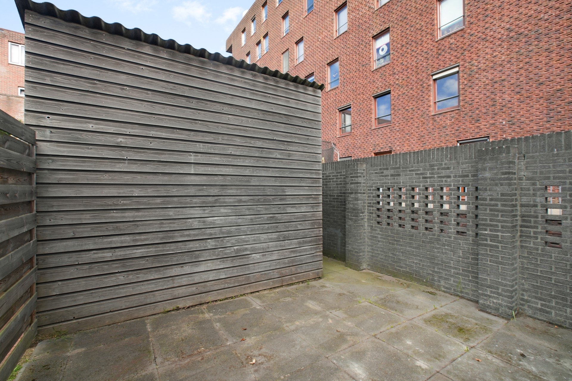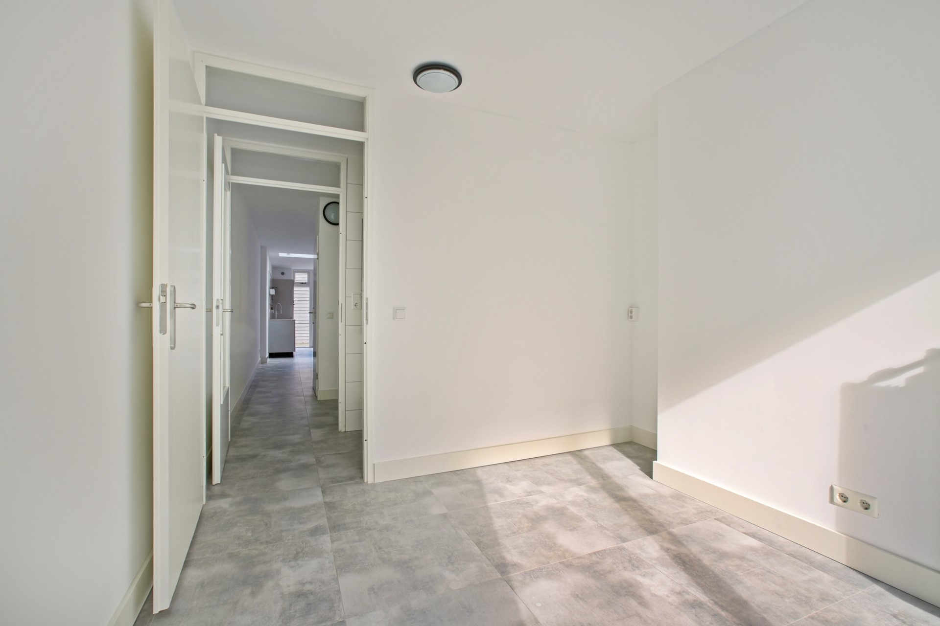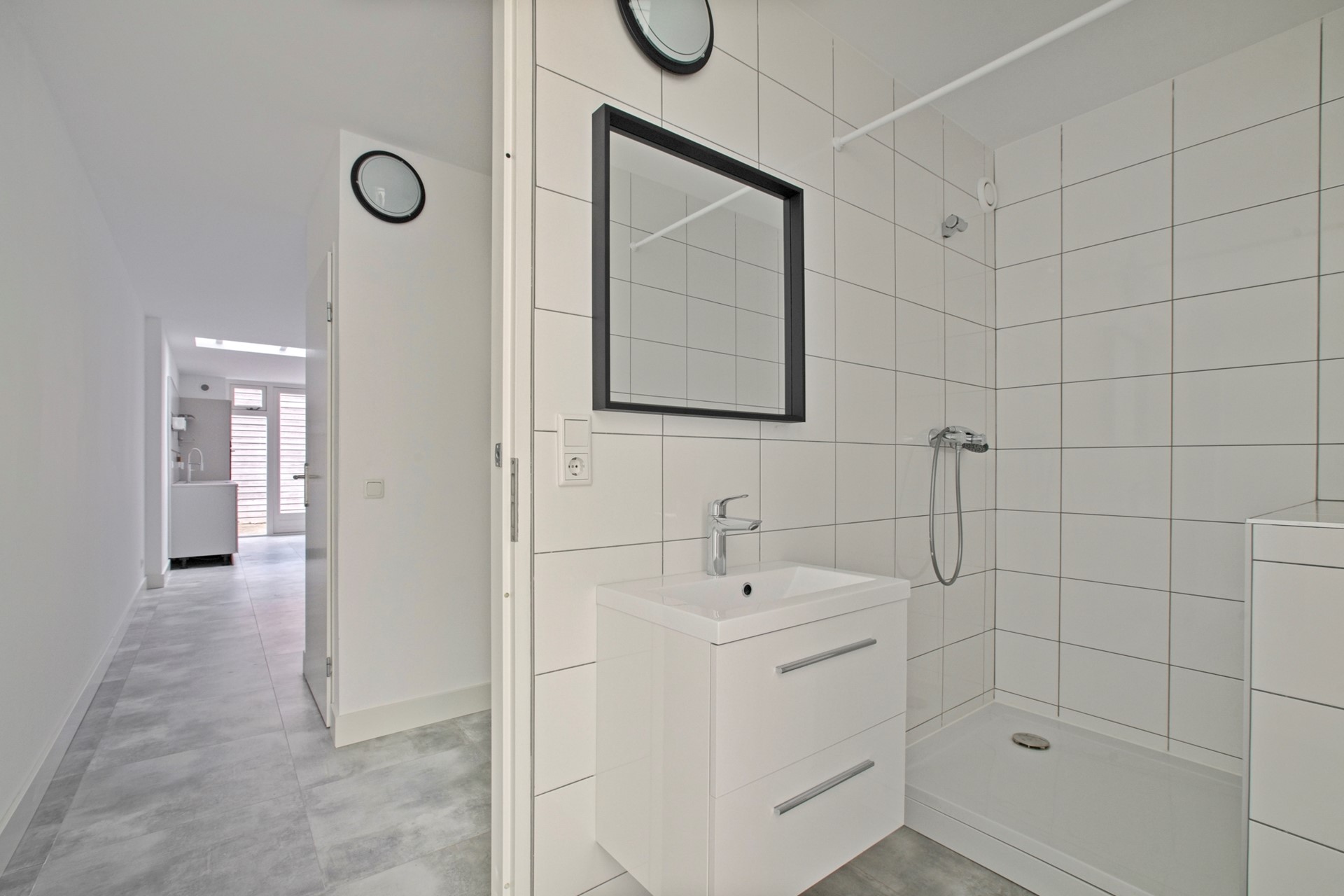 Begane grond: Voortuin, entree, lange hal met separaat toilet met fonteintje. Vanuit de gang kom je in de ruime woonkamer/eetkeuken met de splinternieuwe fraaie open keuken. Zowel de woonkamer als de keuken zijn zeer licht door de grote raampartijen en de dakramen. De moderne en nieuwe open keuken is voorzien van nagenoeg alle denkbare inbouwapparatuur. Vanuit de keuken heb je toegang via de openslaande deuren tot de verzorgde achtertuin. De achtertuin meet ca. 36m2 groot, is onderhoudsvriendelijk aangelegd en gelegen op het noordwesten. In de tuin vind je de grote houten berging en achterom. Aan de voorzijde tref je de eerste badkamer met douche en wastafel en een (slaap)kamer of een praktisch kantoor aan huis.